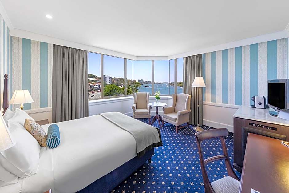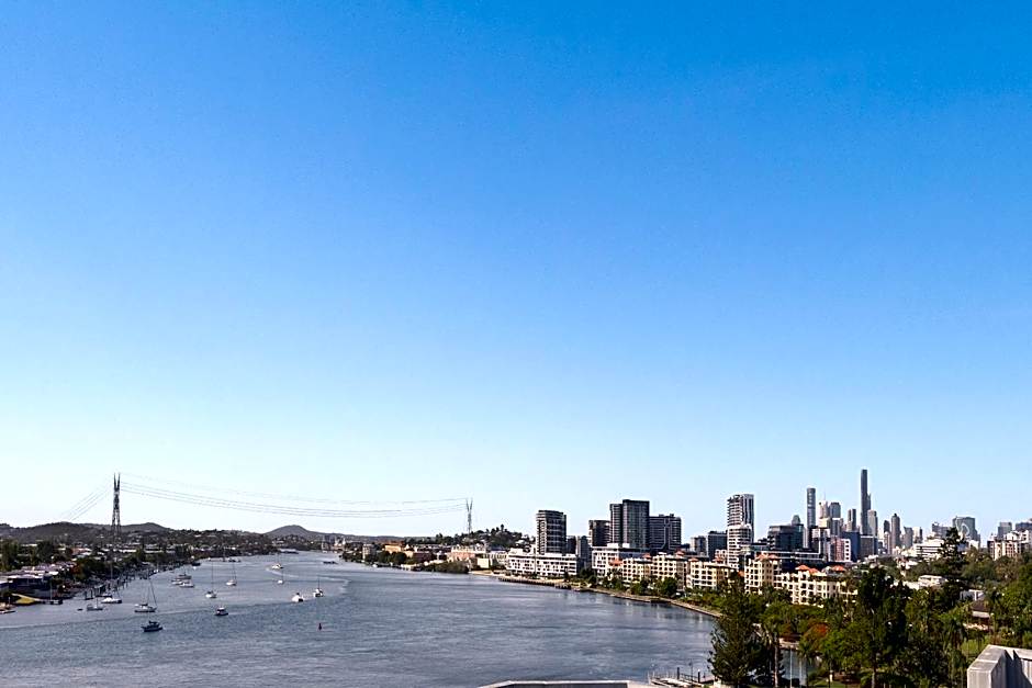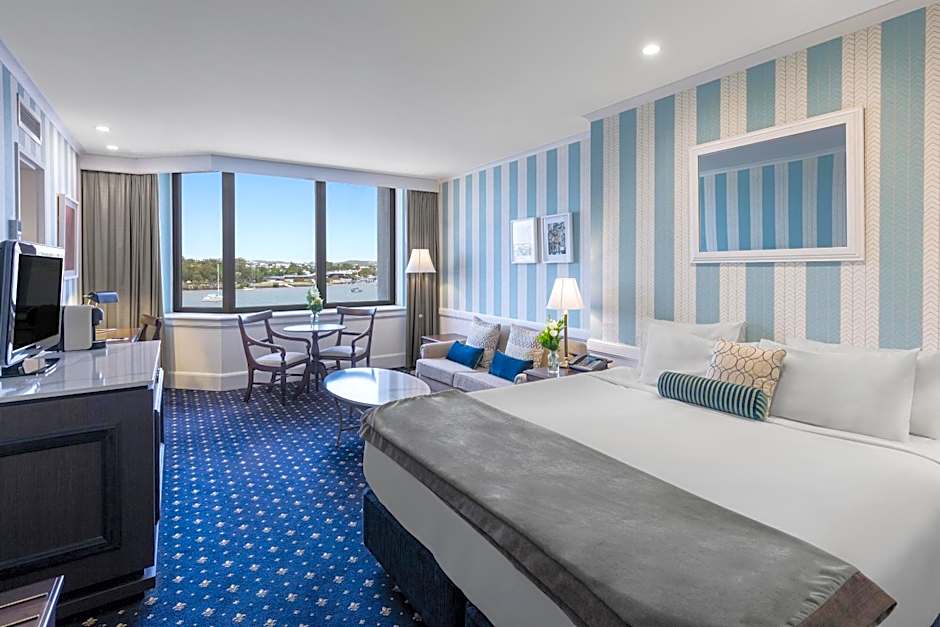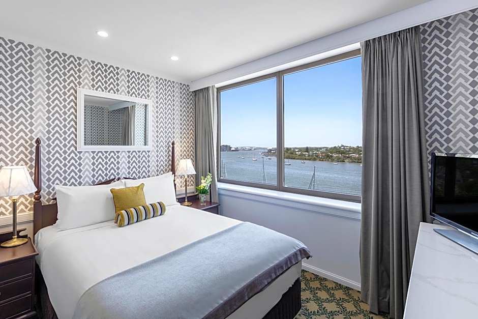 Spacious and well-appointed rooms featuring views of the Brisbane River. Each room includes a queen bed, seating area with a lounge and flat-screen TV. The bathroom features a walk-in shower.